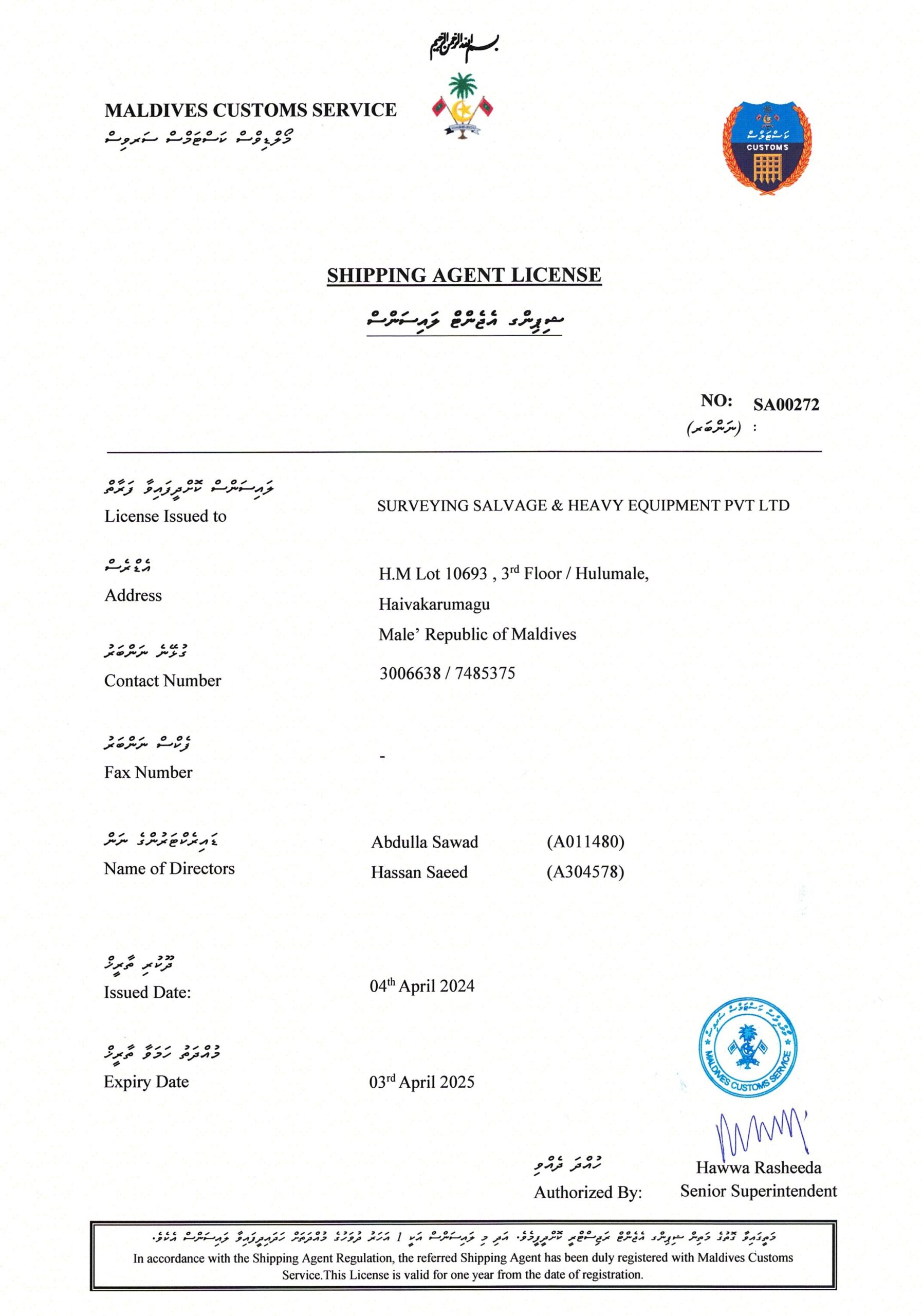 SSHE VESSEL AGENCY LICENSE